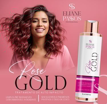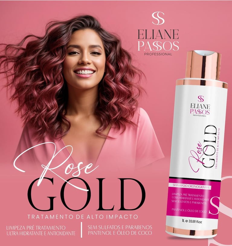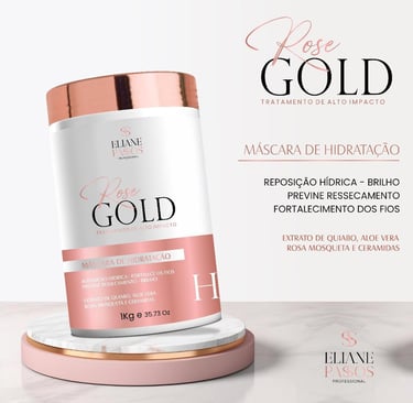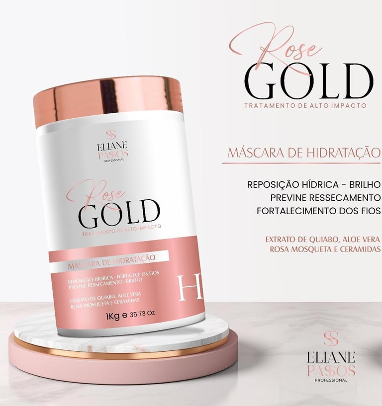 A mascara de alto impacto Rose Gold foi desenvolvida com um revolucionário sistema de tratamento, combinados com ativos inteligentes e formulados com o Extrato de Quiabo, Aloe Vera, Rosa Mosqueta e Ceramidas que hidratam profundamente os fios, revitalizam, rejuvenescem e protegem os cabelos das agressões diárias, desenvolvida com fragrância de perfume árabe, resultando em cabelos perfumados, sem frizz e livres de ressecamento, restaurando sua maciez e vitalidade. Enriquecida com micropartículas de brilho oferece aos cabelos delicadeza e glamour.
