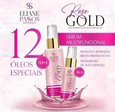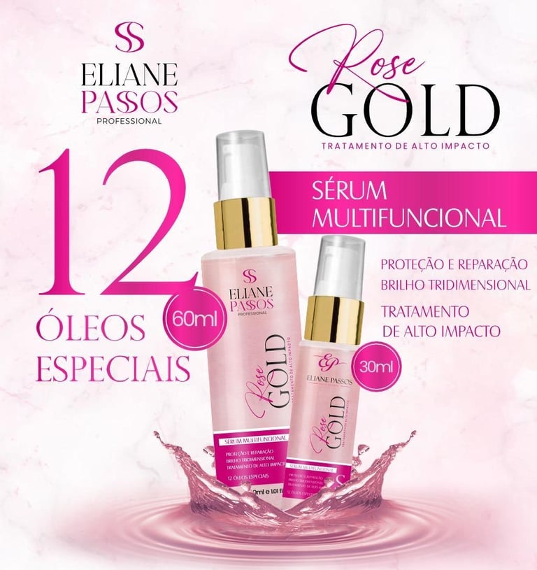 O Sérum multifuncional Rose Gold foi desenvolvido meticulosamente para combater e prevenir pontas duplas, sua tecnologia avançada e inovadora permite ser usada de forma capilar e corporal deixa a pele e os fios com uma textura aveludada, forma um escudo protetor que previne o ressecamento além de ser antifrizz e doador brilho tridimensional. Enriquecido com uma combinação exclusiva de silicones nobres e 12 óleos especiais: Argan, Ojon, Macadâmia, Coco, Oliva, Abacate, Pracaxi, Algodão, Uva, Girassol, Linhaça e Alecrim.