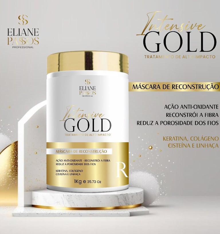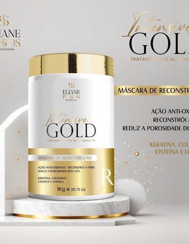 A Máscara de alto impacto Intensive Gold foi desenvolvida especialmente para tratar cabelos extremamente sensibilizados e quimicamente danificados. Formulada com um blend de 10 aminoácidos essenciais para restaurar e reconstruir a fibra capilar. Entre eles temos a Keratina, colágeno, cisteína e o poderoso óleo de linhaça que regenera, nutre e combate pontas duplas. 10 X mais força e elasticidade da raiz as pontas. Sua tecnologia exclusiva equilibra o pH, blinda e condiciona os fios. Enriquecida com nanopartículas de brilho intenso, oferece uma verdadeira preciosidade para os seus cabelos.