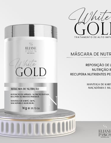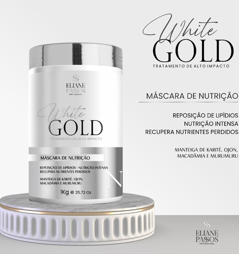 A mascara de alto impacto White Gold conta com ação ultra nutritiva e fortalecedora. Formulada com as melhores manteigas: Karité, Ojon, macadâmia e Murumuru que oferecem nutrição profunda, controle de frizz e brilho tridimensional. Cria uma barreira protetora aos fios evitando o ressecamento causado por processos químicos. Indicado para todos os tipos de cabelos, especialmente aqueles secos e sensibilizados. Enriquecida com microparticulas de brilho oferece uma verdadeira joia para seus cabelos.